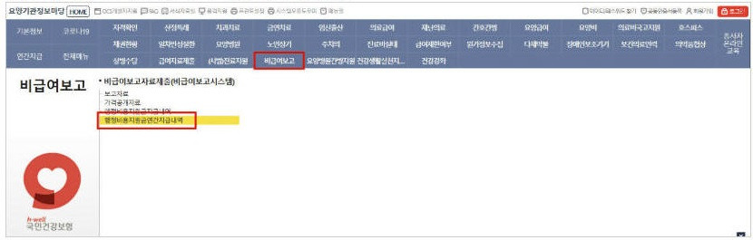 비급여보고 → 행정비용지원금연간지급내역 → 지급년도(2025년) 및 업무구분(행정비용지원금) 선택 → 조회 → 출력