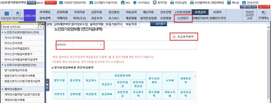 ※ 필요한 경우에만 진행 : 노인장기 → 노인장기요양보험(연간지급내역) → 급여년도의 2025 확인 → 지급내역출력