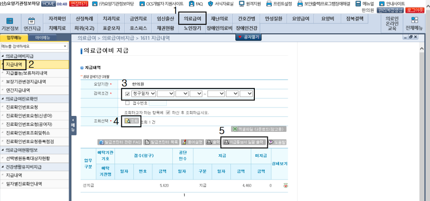 - 의료급여 → 지급내역 → 검색조건의 기간 설정 → 조회 → 지급통보서 일괄출력