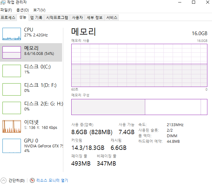 - 아래처럼 현재 메모리 사용량을 확인하여 적정하게 유지(메모리 사용량이 낮을수록 속도에 유리)