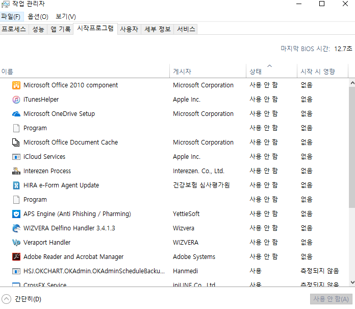 - 시작프로그램 → 자동 실행되고 있는 프로그램 중에서 선별하여 '사용 안 함'으로 처리